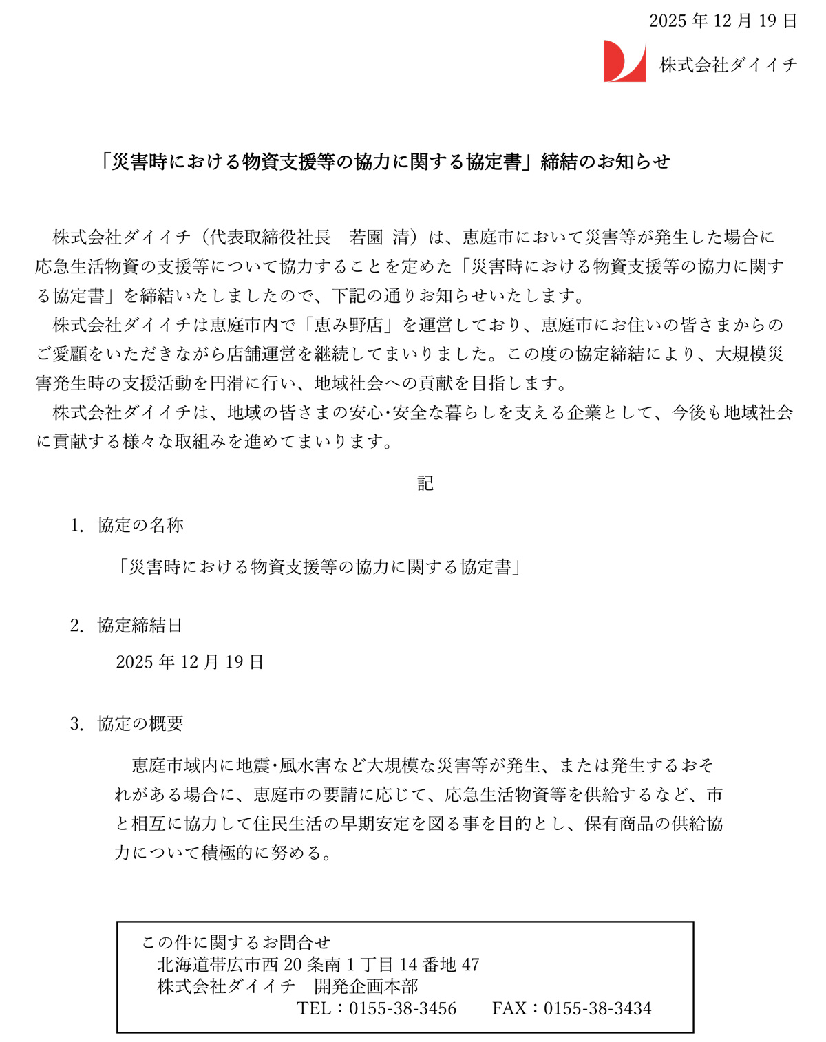 株式会社ダイイチ、社会福祉法人 千歳市社会福祉協議会との地域福祉の推進に関する協定を締結