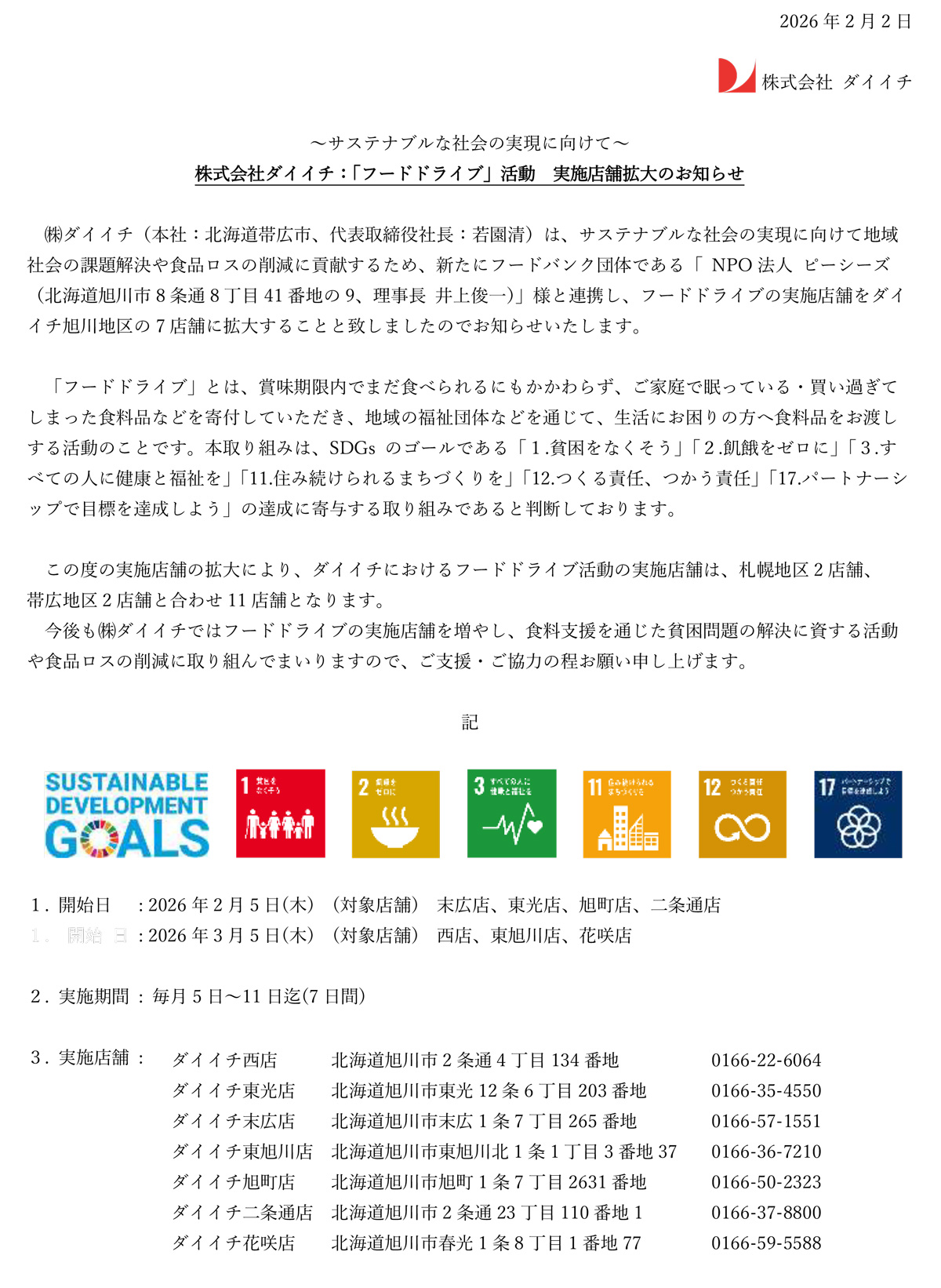 株式会社ダイイチ:「フードドライブ」活動 実施店舗拡大のお知らせ