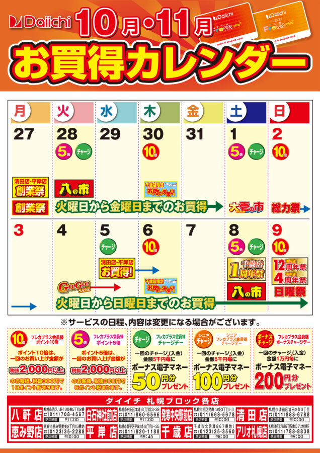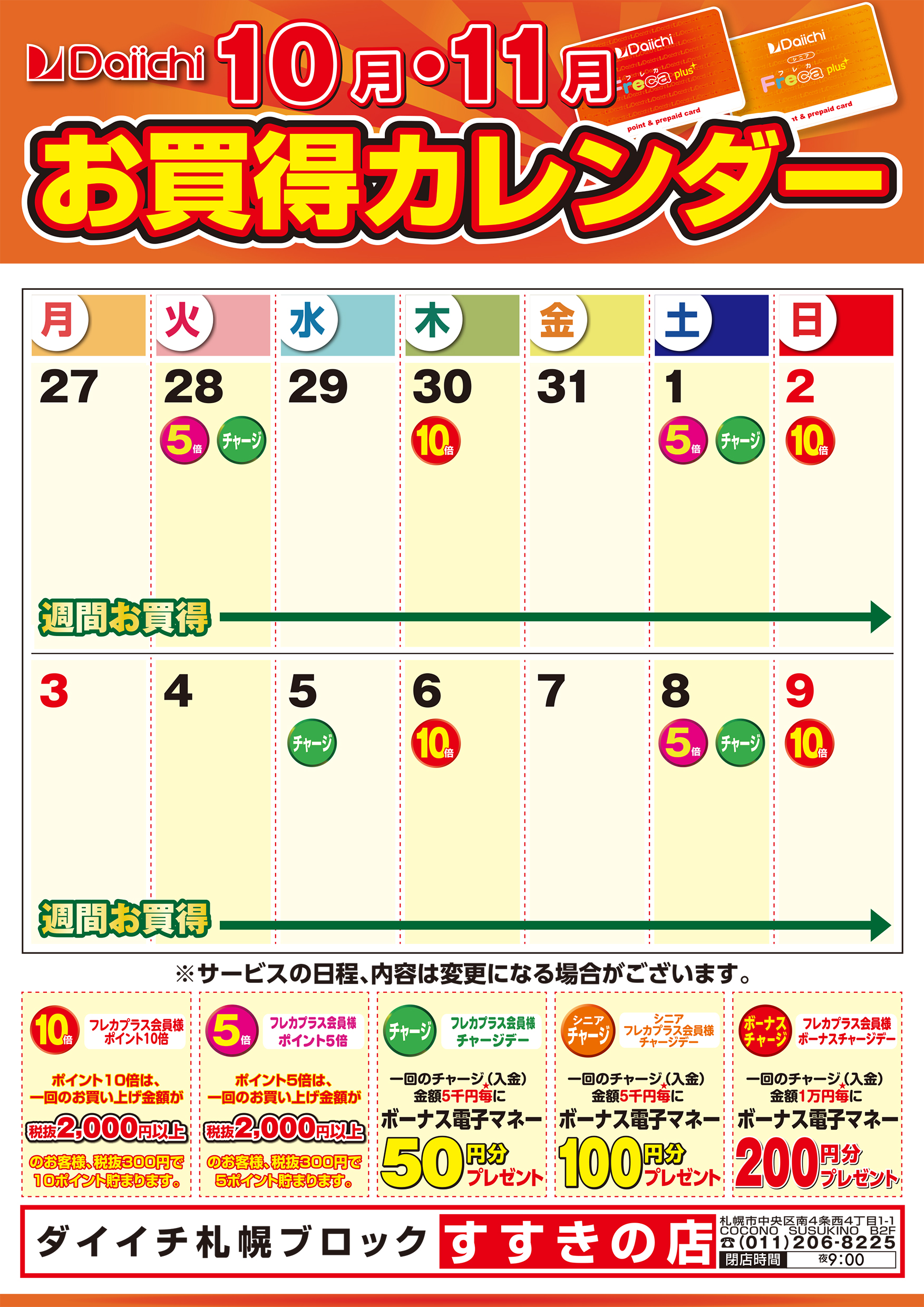 10月・11月お買得カレンダー(札幌) 実施期間 10/27(月)〜11/9(日) 実施店舗 札幌ブロック全店 ▼八軒店、白石神社前店、発寒中央駅前店、清田店、恵み野店、平岸店、千歳店、アリオ札幌店はコチラ ▼すすきの店はコチラ