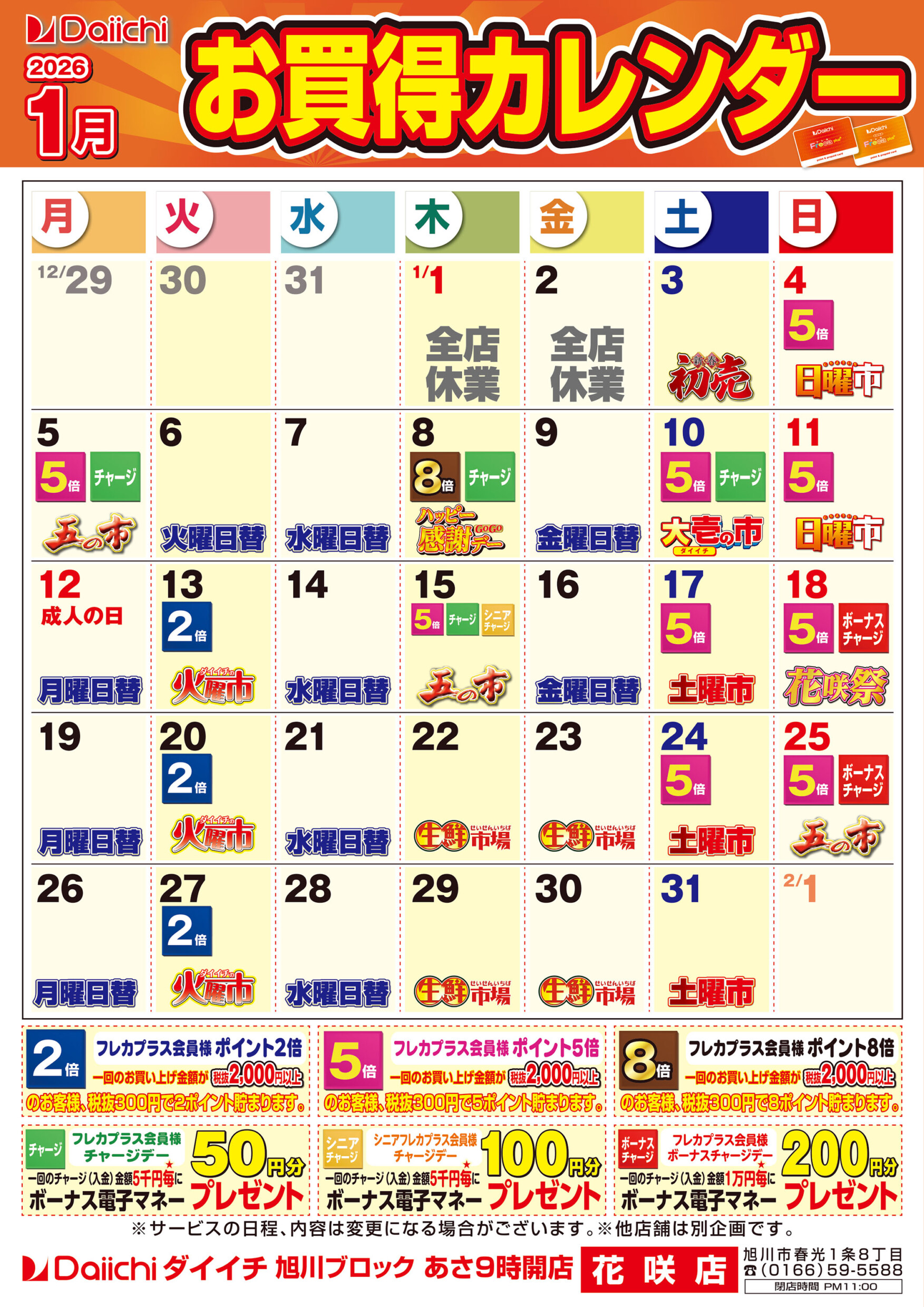 1月お買得カレンダー(旭川) 実施期間 12/1(月)〜12/31(水)、1/1(木)〜1/31(土) 実施店舗 旭川ブロック全店 ▼【2026年1月】西店、東光店、末広店、東旭川店、旭町店、二条通店はコチラ ▼【2026年1月】花咲店はコチラ