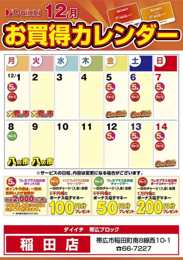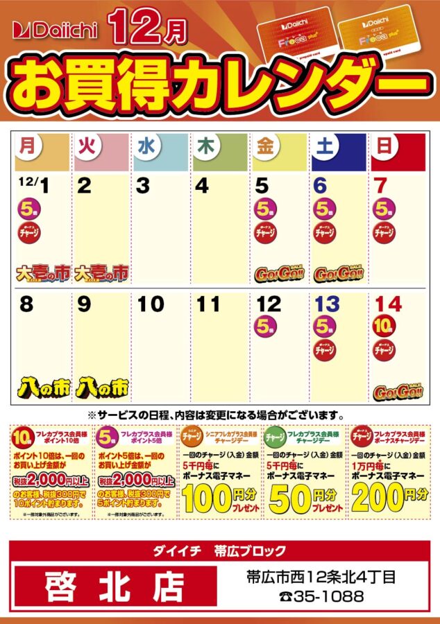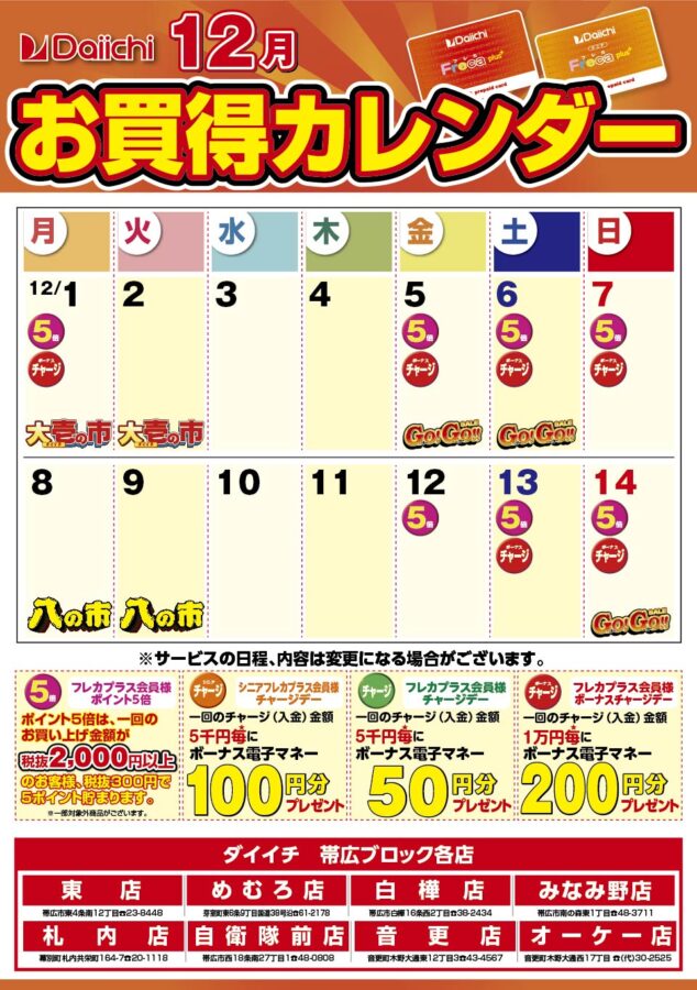 12月お買得カレンダー(帯広) 実施期間 12/1(月)〜12/14(日) 実施店舗 帯広ブロック全店 ▼東店、めむろ店、白樺店、みなみ野店、札内店、自衛隊前店、音更店、オーケー店はコチラ ▼啓北店はコチラ ▼稲田店はコチラ