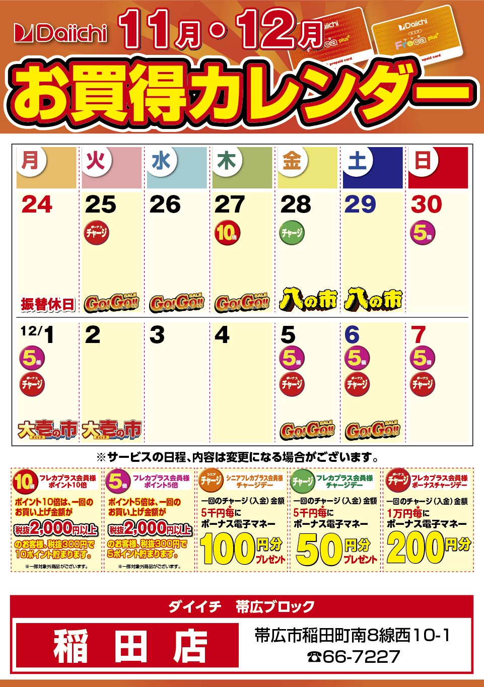 11月・12月お買得カレンダー(帯広) 実施期間 11/24(月)〜12/7(日) 実施店舗 帯広ブロック全店 ▼東店、啓北店、めむろ店、白樺店、みなみ野店、札内店、自衛隊前店、音更店、オーケー店はコチラ ▼稲田店はコチラ