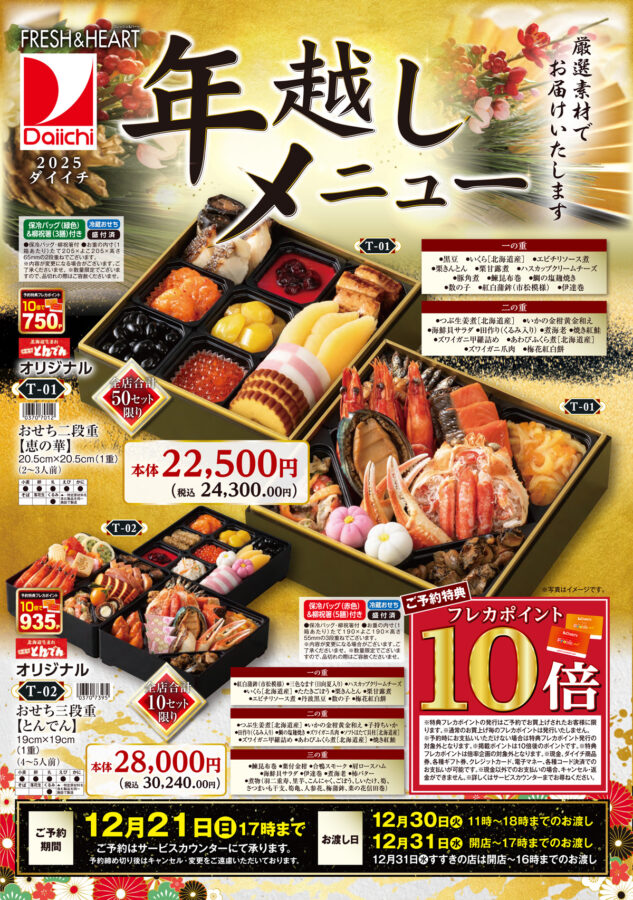 2025 ダイイチの年越しメニュー 実施期間 ご予約期間:12月21日(日)17時までお渡し日:12月30日(火)11時~18時までのお渡し・12月31日(水)開店~17時までのお渡し 実施店舗 帯広ブロック全店 電子Bookを見る