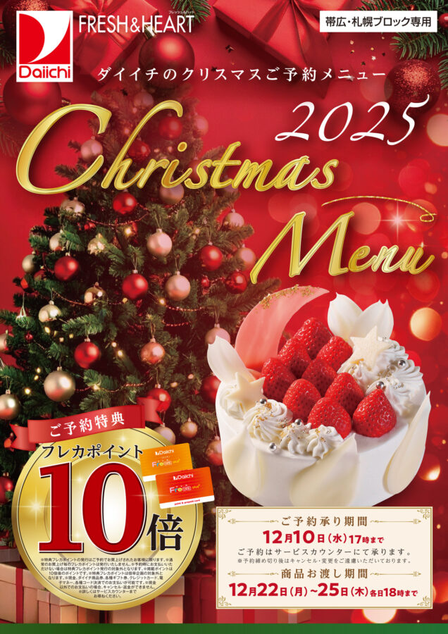 2025ダイイチのクリスマスご予約メニュー 実施期間 ご予約承り期間:12月10日(水)17時まで商品お渡し期間:12月22日(月)~25日(木)各日18時まで 実施店舗 札幌ブロック全店 電子Bookを見る